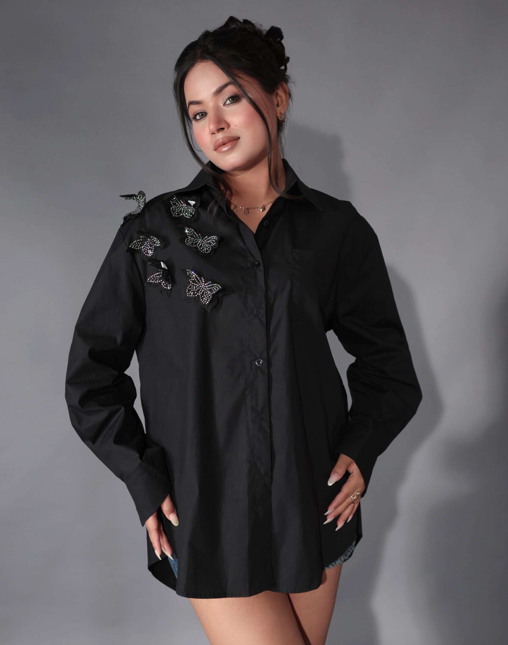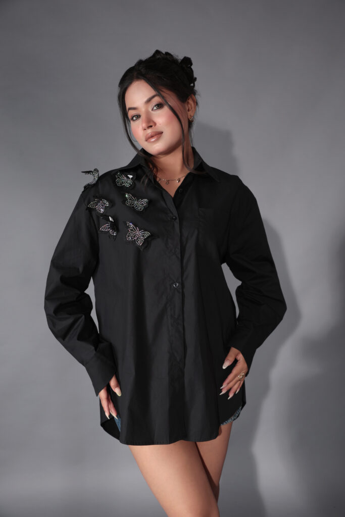 Draw attention with this Butterfly Embellished Oversized Black Shirt. It has an edgy back zip, eye-catching 3D butterflies,