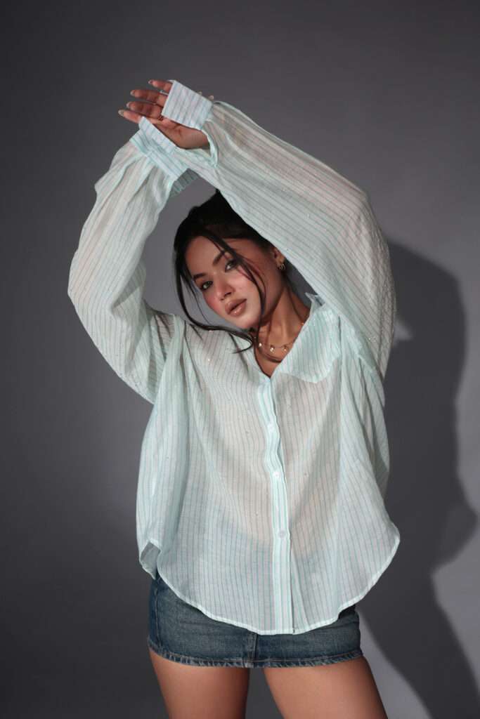 This Oversized Floral Pearl Embellished Shirt for Women is sure to draw attention with its eye-catching pearl embellishments and delicate floral embroidery. Because it is composed of breathable cotton,