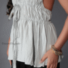 Style: Sleeveless halter top with a gathered/ruched waist and backless design