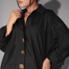 The black oversized shirt with gold buttons is versatile enough for a range of occasions, from casual days to semi-formal gatherings. Whether you’re meeting friends for lunch or attending a casual office event, this shirt adds a fashionable twist to any outfit.