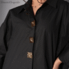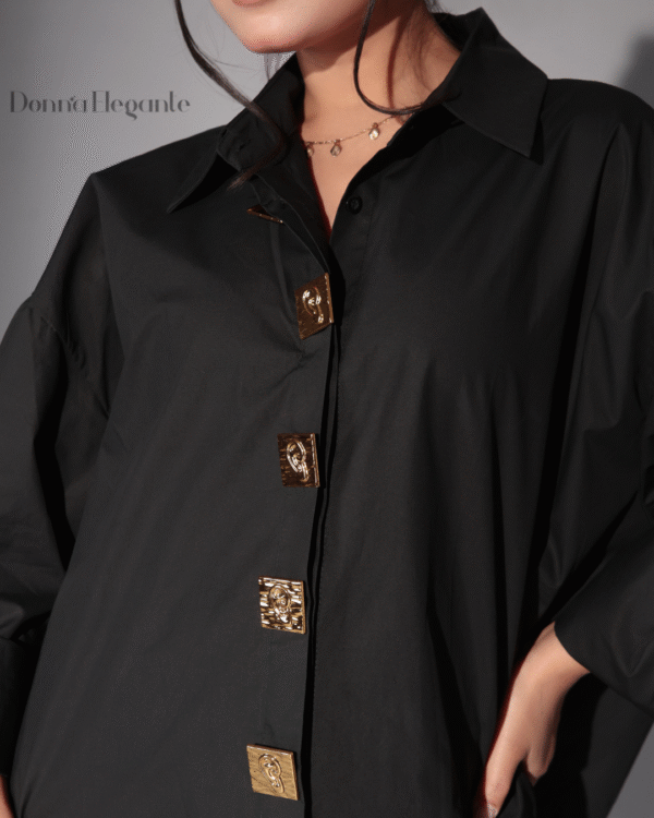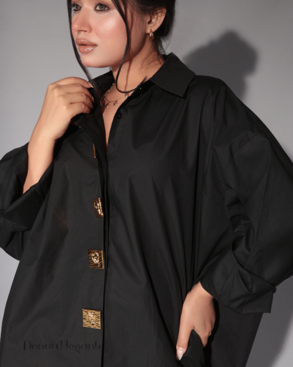 Donna Elegante’s black oversized shirt stands out with its bold gold buttons and oversized fit, making it both chic and comfortable. The shirt’s modern and luxurious design makes it a statement piece for any occasion, whether casual or semi-formal.