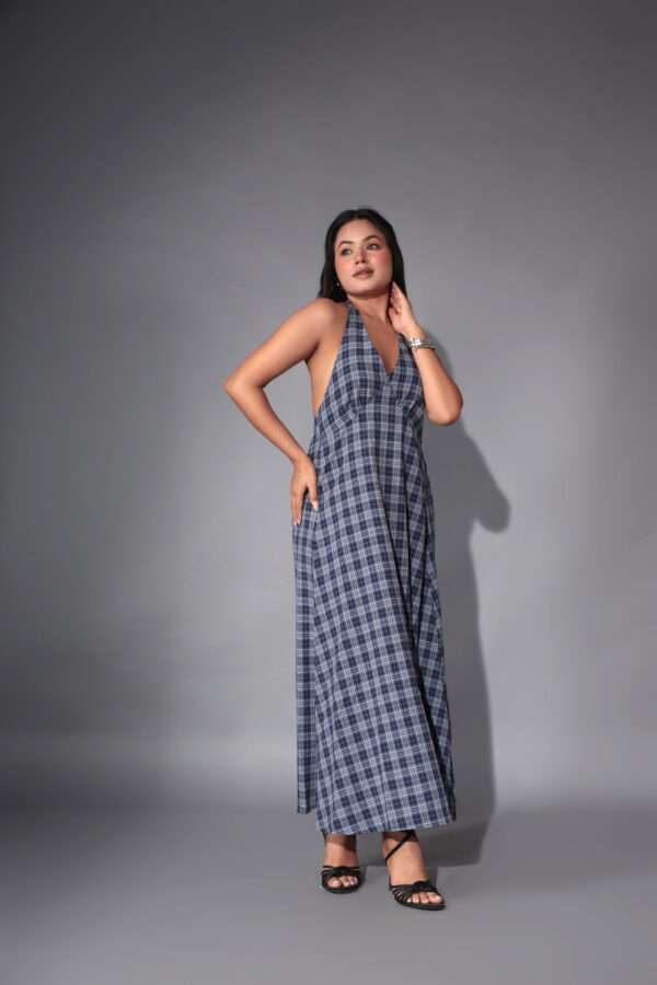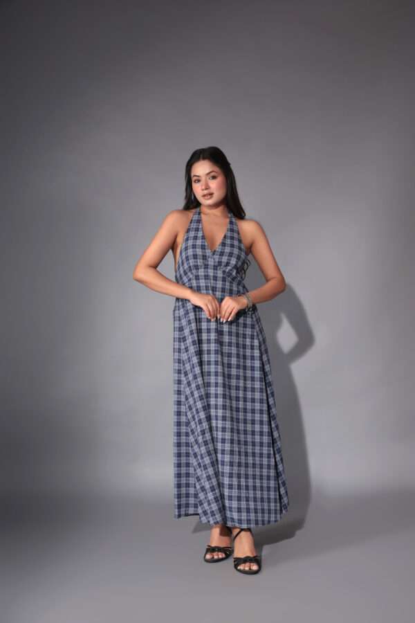 Say hello to your new favorite warm-weather outfit — the Blue Checkered Halter Maxi Dress. This dress is made for sunny days, weekend brunches, beach strolls, and everything. With its soft, flowy silhouette, flattering halter neckline, and open-back design, it’s the piece you’ll want to wear on repeat.