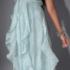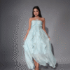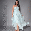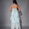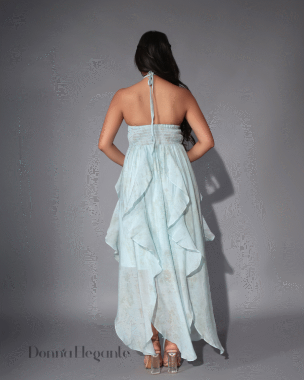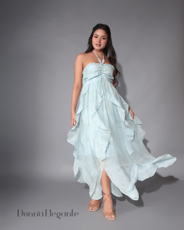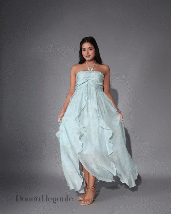 The strapless design with a delicate halter neck tie gives it a romantic boho vibe, while the gentle ruching at the bust and cascading ruffles add flow, volume, and a soft feminine touch. The pastel blue color is soothing and graceful — just like the feel of summer skies.