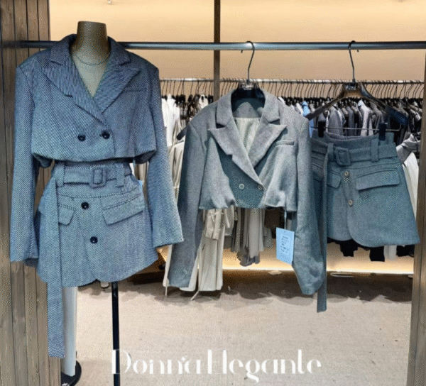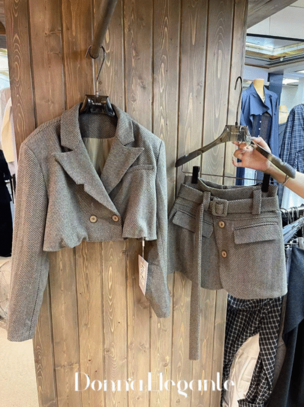 • Style: Double-breasted cropped blazer, belted high-waisted skirt