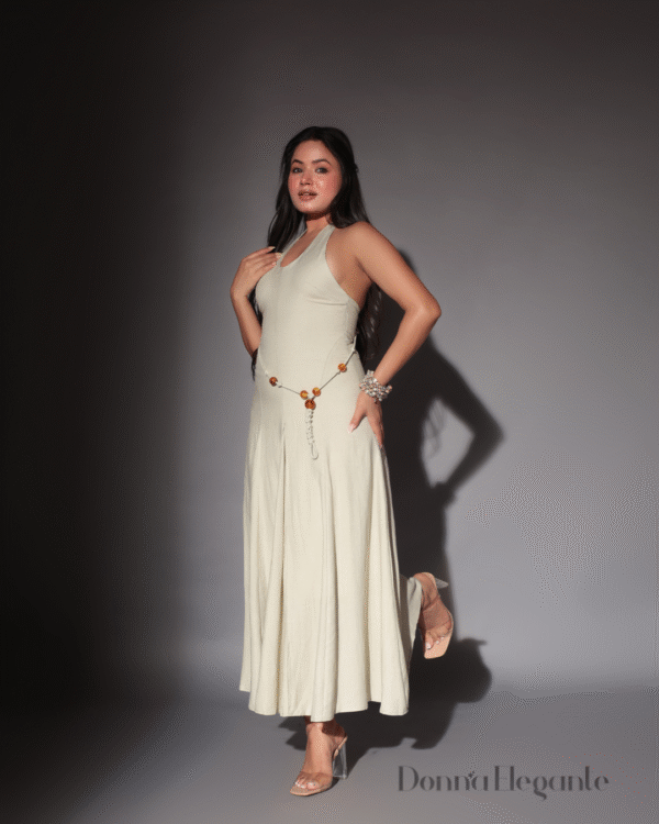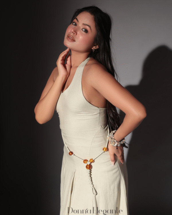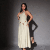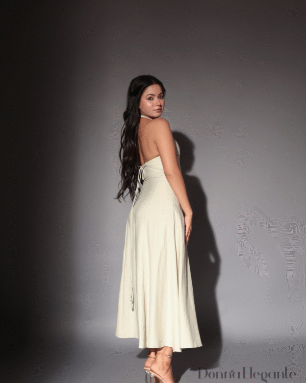 There’s something effortlessly beautiful about a dress that moves with you, and this halter neck backless midi dress does just that. Designed in a soft, airy ivory cotton-linen blend, it feels light and breathable, making it your go-to for warm days and relaxed evenings.Whether you’re dressing up for a beachside dinner, heading to a garden party, or simply enjoying a slow summer day, this halter neck backless midi dress makes you feel put-together without trying too hard.