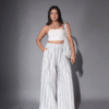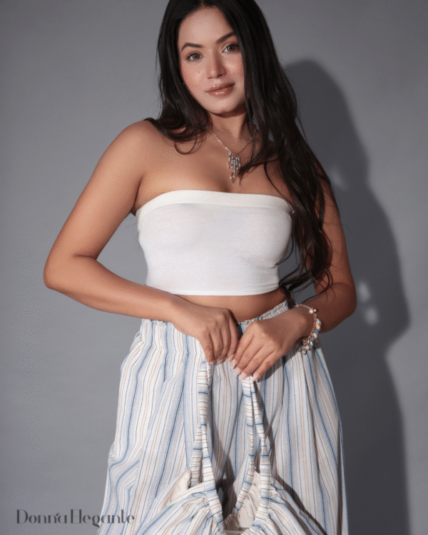 Step into effortless style with our Navy Blue Striped Bag & Wide-Leg Pants designed for women who love a perfect blend of comfort and chic. Crafted from breathable cotton fabric, this lightweight co-ord set keeps you cool and confident all day long.The striped pattern in a rich navy blue tone adds a fresh, timeless vibe, while the delicate lace trim on the edges brings a touch of elegance. The outfit features a crop top with a bandeau fit and wide-leg pants with an elasticated waistband, giving you a flattering silhouette without sacrificing ease.Ideal for brunch dates, summer outings, beach vacations, or casual gatherings, this co-ord set for women is your go-to for dressing up without trying too hard. Pair it with minimal jewelry and strappy sandals for a laid-back yet polished look.