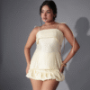 Say hello to your new favorite summer piece – this ruffle hem playsuit is what effortless style looks like. Made from a soft, flowy satin-blend fabric, it feels light on the skin and drapes beautifully. The buttery cream color gives it a fresh, dreamy vibe that’s perfect for sunny days.