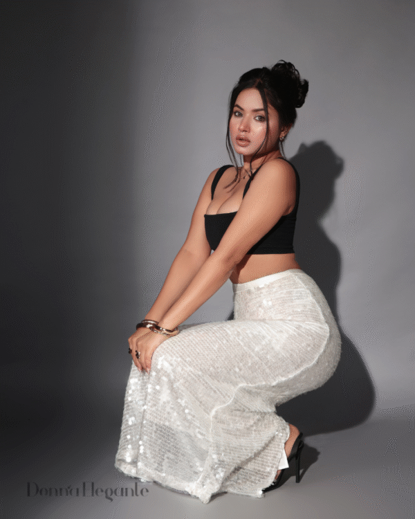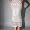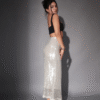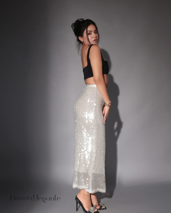 This skirt, which combines comfort and sparkle, is made from a soft mesh base that is layered with shimmering sequins. The midi length adds a touch of sophistication, and the high-waisted fit tightens the waist. It’s ideal for dancing the night away because of the delicate back slit, which improves movement and adds a touch of allure.